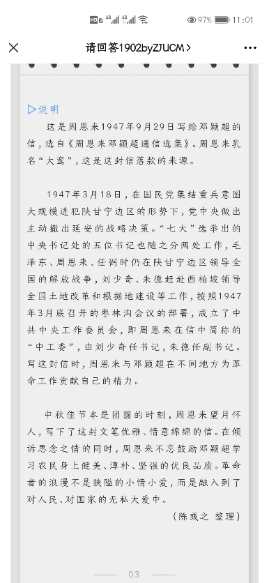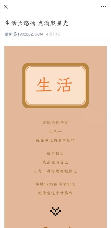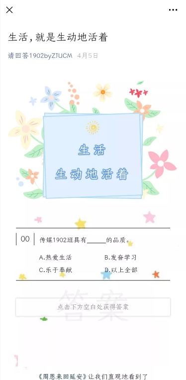 他们在做的,不仅仅是向内的自我探索,更有面向社会大众的普及式宣传。他们通过多种新媒体平台开展宣传,将每个人“疫情宅家”的生活点滴与学习周恩来的精神事迹结合起来,向社会展现了当代大学生积极向上的精神风貌和进取态度。