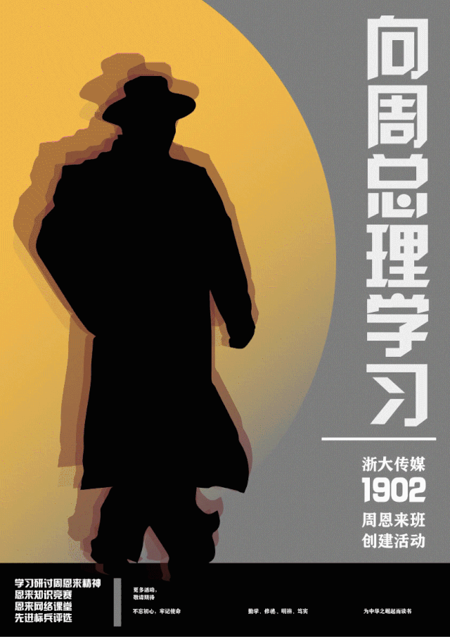 活动伊始,传媒1902班便设计并发布了“向周总理致敬”的主题海报,简洁大方的黑白灰三色构成主色,黑色的周总理的背影剪影,生动形象地展现了周恩来总理的伟岸形象。加以黄色光影,构成了静态版海报和推文的banner。而在动态版海报中,黄色背景被替换成了多种颜色的交替闪烁,令人眼前一亮,给人以更加强大的视觉冲击力。