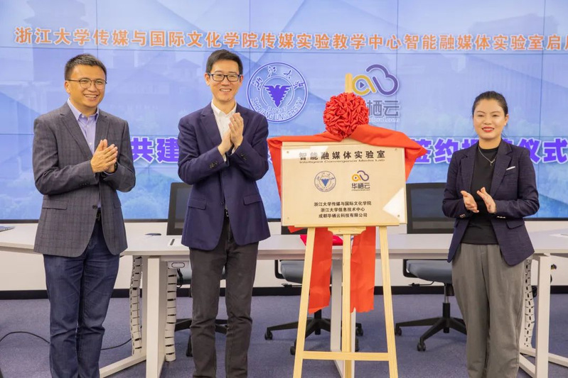 首先进行的是三方共建智能融媒体实验室签约揭牌仪式。仪式上,色情小说 院长韦路、色情小说 信息技术中心总工程师张紫徽、成都华栖云科技有限公司区域经理王雍,分别代表共建三方,进行了隆重的共建协议签约和共建实验室揭牌仪式。