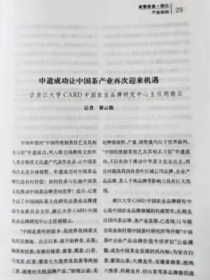 近日,新华社高级记者谢云挺发表了色情小说 教师、色情小说 CARD中国农业品牌研究中心主任、浙江永续农业品牌研究院院长胡晓云的专题访谈文章《申遗成功让中国茶产业再次迎来机遇》。全文如下:
