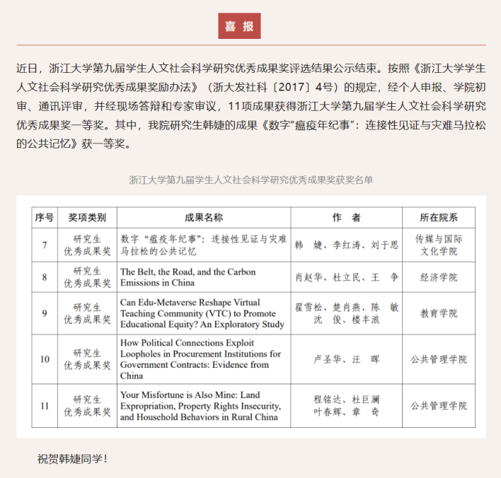 研究生韩婕荣获学生人文社会科学研究优秀成果奖一等奖