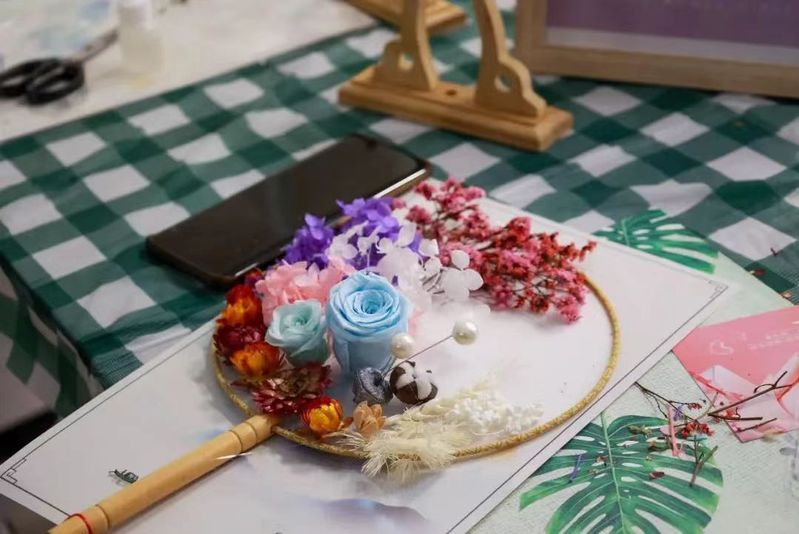 活动开始,指导老师为大家介绍了团扇的寓意、永生花的加工过程、花艺团扇的制作材料和技巧。随后,各位老师们自由发挥创意,巧妙搭配干花,嵌于素白扇面,相互观摩交流,活动现场气氛活跃,欢声笑语不断。用花的缤纷点缀扇的风姿,现代的创意融合古雅的风韵,尽显女性的风采与魅力。