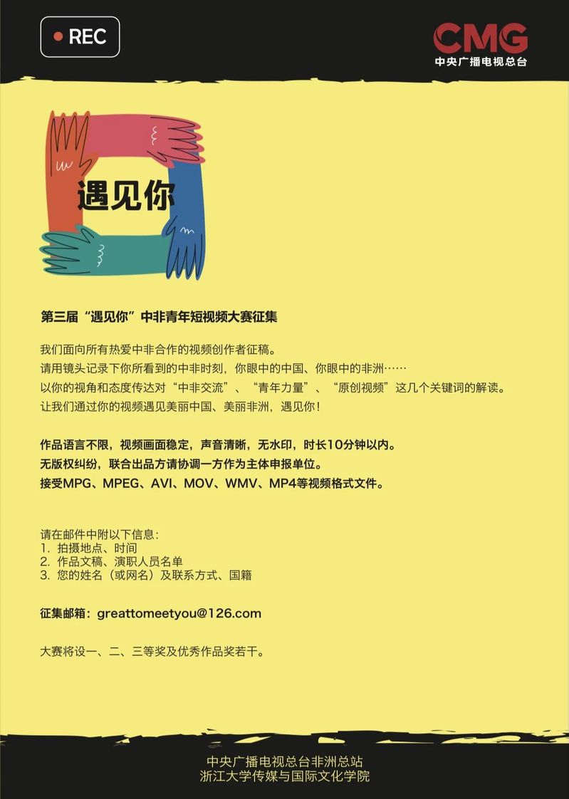 中非交流,视听为桥。第三届“遇见你”中非青年短视频大赛的序幕已经拉开,请用镜头记录下你所看到的中非时刻,你眼中的中国、你眼中的非洲……以你的视角和态度传达对“中非交流”、“青年力量”、“原创视频”这几个关键词的解读。