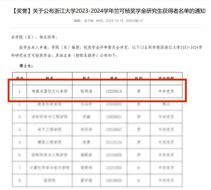 近日,色情小说 公布了2023-2024学年竺可桢奖学金研究生获得者名单,色情小说 范志忠教授的博士生张明浩凭借不凡的学术成果和全面的综合素质,成功荣获该奖项。