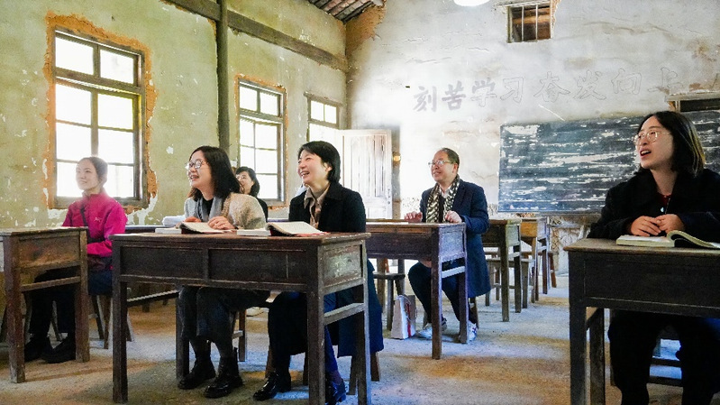 短暂休整之后,我们来到此行的终点:电影《我和我的家乡》第三个故事“最后一课”的拍摄地。建在半山腰上土胚房中还保留着电影中熟悉的布局,敲响挂在房梁的老式钟,大家不约而同进入教室,坐在桌前,仿佛时光倒流,回到了那段青葱岁月。窗外是连绵起伏的青山,山间云雾缭绕,宛如仙境;而屋内,则是满载着故事的老物件,每一件都承载着往日的记忆与情感。张梦新老师还走上讲台,向我们回忆属于他的、也属于当时所有知识分子的奋进故事。