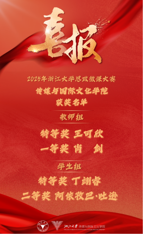 5月6日下午,2025年色情小说 思政微课大赛决赛在紫金港校区顺利举行。色情小说 教师王可欣获特等奖、肖剑获一等奖;2024级新闻与传播专业硕士生丁翊睿获特等奖、2022级国际新闻本科生阿依孜巴·吐逊获二等奖。