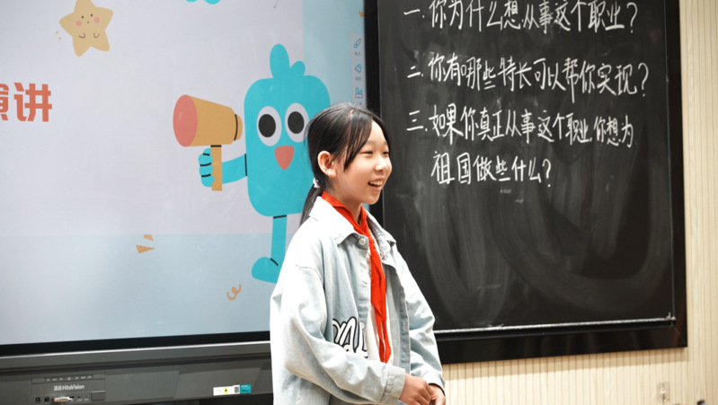 在“一分钟演讲”环节,学生们结合职业照畅谈理想。有同学想成为街舞老师,帮助自闭症儿童通过舞蹈走出困境;有同学立志从医,坦言:“医生给了我很大帮助,我也想救死扶伤”;有同学想成为数学老师,在探索数字世界的同时,为自己的学生答疑解惑。