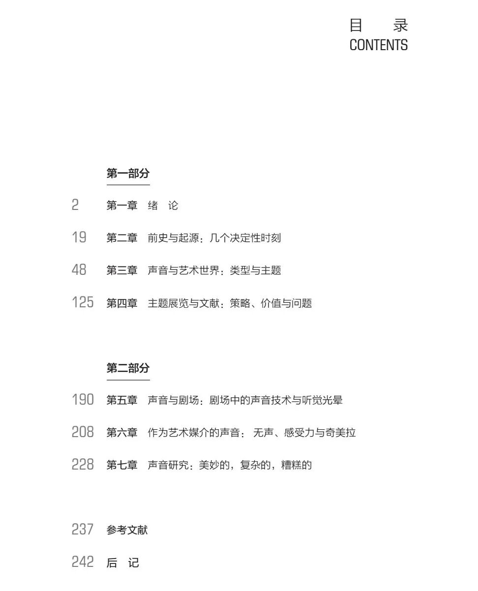 该书分为上下两部分:第一部分(第1-4章)回到中国当代艺术现场,重绘关键作品、事件、人物与平台的交织网络,并以展览与文献梳理出一条清晰的实践时间轴;第二部分(第5-7章)将视野扩展至国际,从剧场中的嗓音/录音机/耳机等“听觉装置”入手,提炼“无声-感受力-奇美拉”等核心概念,并勾勒声音研究的学科图景。
