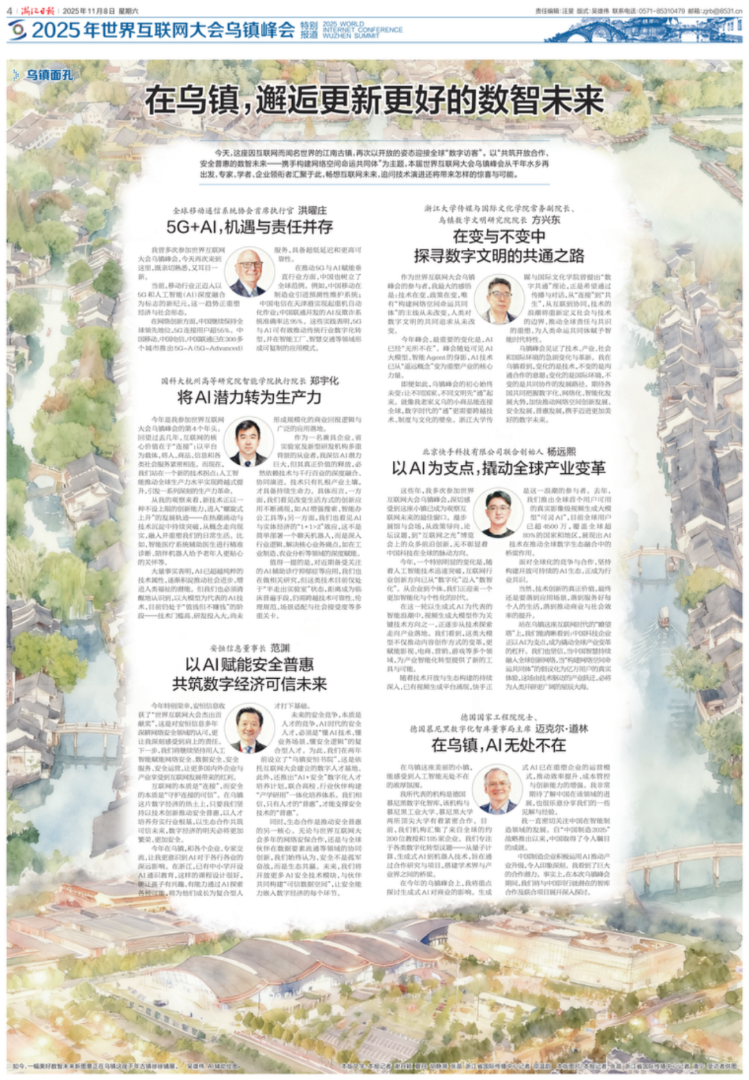 “技术在变、政策在变,唯有‘构建网络空间命运共同体’的主线从未改变。”在2025年世界互联网大会乌镇峰会期间,学院常务副院长方兴东的发言被《浙江日报》收录。峰会期间,学院不仅通过联合策划“在桐乡看见数字文明”系列乌镇咖荟深度参与全球数字治理对话,更以“数字共通”理论为全球网络空间建设贡献了浙江智慧与浙大方案。