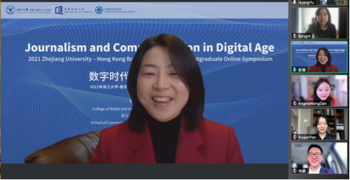 HANGZHOU—The 2021 Zhejiang University-Hong Kong Baptist University Joint Postgraduate Online Symposium was held on December 17. Themed “Journalism and Communication in the Digital Era”, the event was a joint effort of the College of Media and International Culture (CMIC) of Zhejiang University and the School of Communication and Film, Hong Kong Baptist University. Prof. Huang Yu, dean of the School of Communication and Film, Prof. Wei Lu, dean of CMIC, Prof. Zhao Yu, associate dean of CMIC, together with other scholars like Prof. Song Yunya, Dr. Vincent Huang, Dr. Angela Wang Dan, Dr. Yan Yuqian, Dr. Huang Guangsheng, and Dr. Ji Yingru participated in this online symposium.