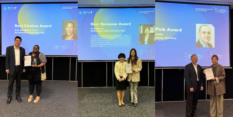 Finally, Associate Professor Huang Zhao from the Tenth University of Paris presided over the award ceremony and commended three scholars who made special contributions to the journal Communication and the Public. They are Professor Meredith D. Clark from Northeastern University, who won the Best Citation Award, Professor Chen Li from West Texas A&M University, who won the Best Reviewer Award, and Professor Christian Fuchs from Paderborn University, who won the Best Editor Award. Subsequently, the speech videos of the three winners were played on site. Fang Xingdong, Executive Vice Dean of the College of Media and International Culture at Zhejiang University, Professor Wu Fei from the College of Media and International Culture at Zhejiang University, and Professor Huang Yihui from City University of Hong Kong jointly presented trophies and certificates to the award-winning guests. After the award ceremony, the attending scholars had in-depth exchanges with the journal editors.