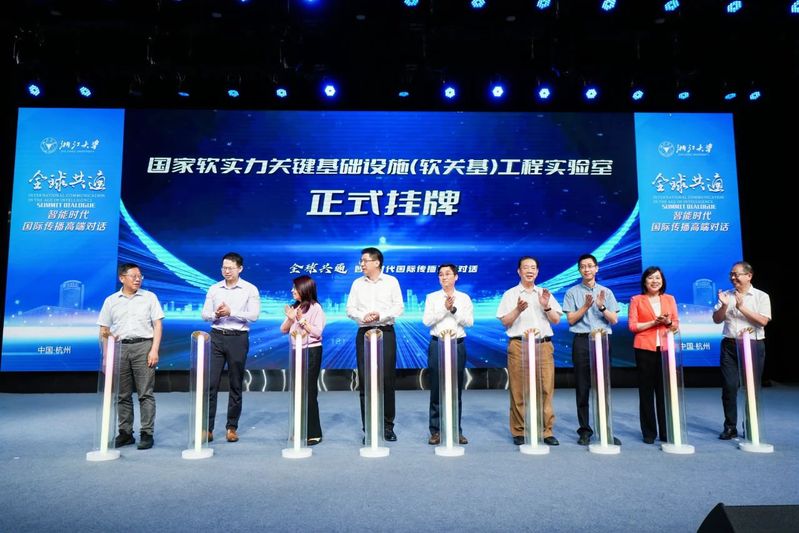 Huang Xiangfeng, Deputy Secretary of the Party Committee and Secretary of the Discipline Inspection Commission of Zhejiang University, Zhou Xisheng, former Vice President of Xinhua News Agency and the first President and Editor-in-Chief of Xinhuanet, Fu Fangzheng, Executive Deputy Director of the Propaganda Department of the Party Committee of Zhejiang University; Li Min, Director of the Office of International Cooperation and Exchange of Zhejiang University; Yuan Qing, Executive Vice Dean of the Beijing Research Institute of Zhejiang University; Gong Binlei, Vice Dean of the Research Institute of Social Sciences of Zhejiang University; Fang Xingdong, Executive Deputy Dean of School of Media and International Culture, Zhejiang University, Wang Qingwen, Party Secretary, and Wu Fei, Director of International spread Research Center, Zhejiang University, witnessed the unveiling of National Soft Power Critical Infrastructure (Soft Base) Engineering Laboratory.