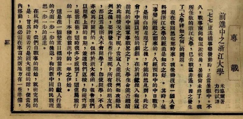 In January 1939, the Asia magazine published an article titled A University on the March, written by Zhejiang University's foreign teacher Franz Michael. Through this piece, Michael depicted the spirit of Zhejiang University's faculty and students as they bravely faced adversity, worked diligently, and remained devoted to their homeland while relocating westward to continue their education and research. This article was later translated into Chinese and was reprinted in the National Zhejiang University Bulletin on March 13, 1939.